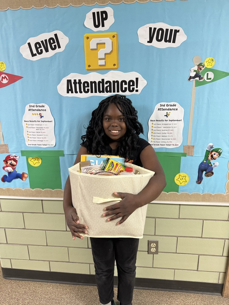 Congratulations to this 3rd grader for winning the drawing for the Fall Fun Basket for her 1st Quarter attendance! There were almost 140 students in the raffle. Way to go!