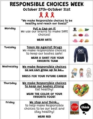 Don't forget that we are finishing out our month about Responsibility with Responsible Choices Week! Monday is HAT DAY!